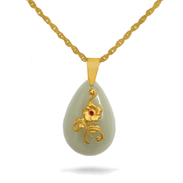The Gloria Jade and Gold-Plated Necklace is considered a symbol of indescribable beauty, clarity, and radiance. The stone set in this woman’s necklace is light green nephrite, a precious natural mineral. It is one of the finest types of jade, which can be found in white, cream, and green shades.